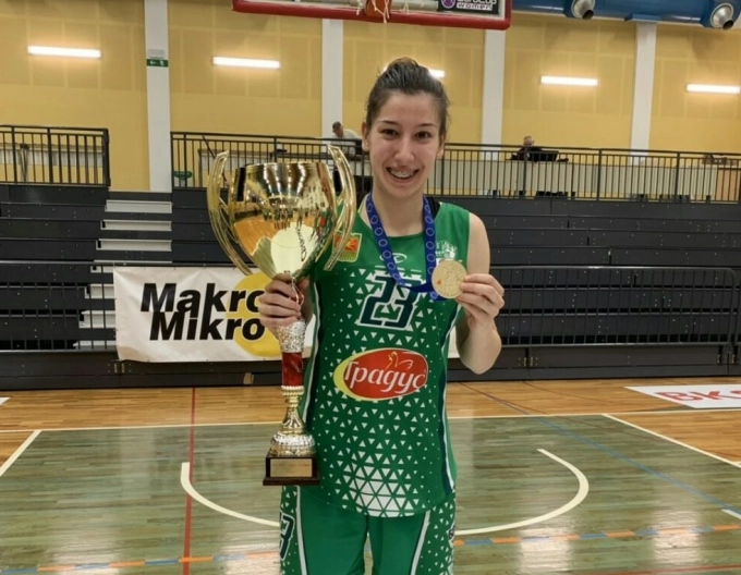 Гергана Иванова, която прави първи стъпки в баскетбола в Севлиево, с купата на Адриатическата лига, снимка: личен архив