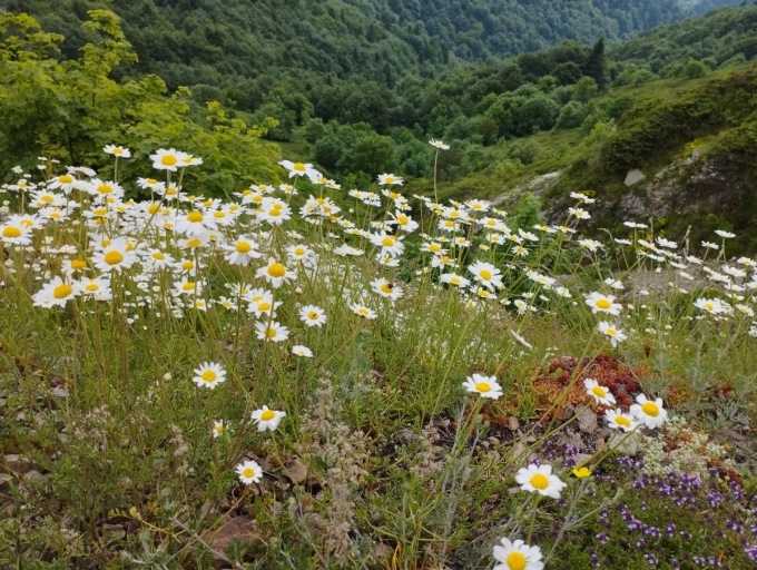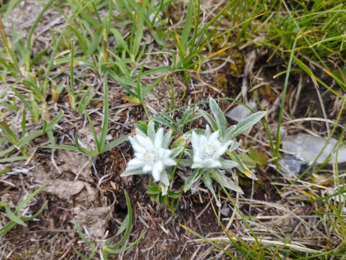 Почти в началото на прехода, попаднахме на гледка, която ни умили. Едно теленце току-що се беше родило. Още мокро и блестящо, то лежеше свито в краката на майка си. Малка карамелено-кафява топка – новото попълнение на стадото. Вървим по билото, което нагоре става по-стръмно и по-тясно. Скали, поляни с мащерка и бели маргаритки, полегнали хвойнови храсти. И пак скали... Малко страшно по ръба, но има стоманени въжета, на които да се държим. И винаги се намира някой, който да ти подаде ръка в трудния момент. Стръмното свършва, пред нас се простира подножието на поредния хълм, а хижата е още мираж. Еделвайсите забелязах когато се наведох да си вържа маратонката. Сякаш бяха избрали да се покажат точно на мен. Като се загледаш, откриваш и други: мънички, нежни, космати като лапи от власинките по тях. Латинското име на еделвайса е Leontopodium и означава „лъвска лапа“.
