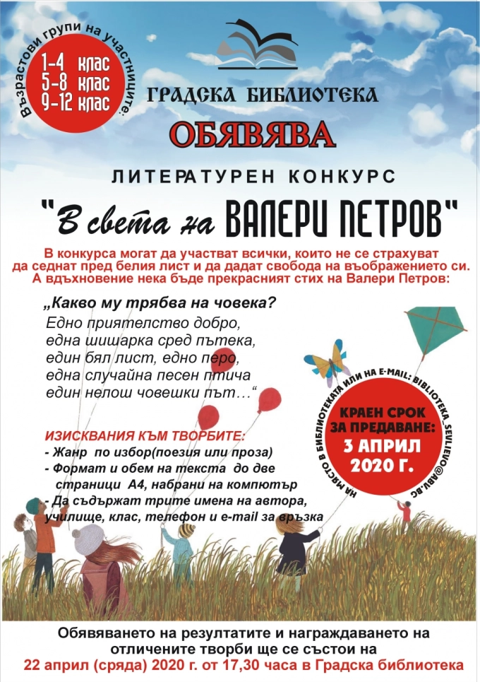 Градска библиотека Севлиево обявава за четвърта поредна година литературен конкурс за деца и младежи. Тази година той ще бъде свързан със 100-годишнината от рождението на един истински вълшебник на словото – Валери Петров – поет, драматург, сценарист, преводач, заради което конкурсът е озаглавен "В света на Валери Петров"