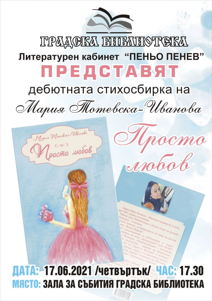 Литературната вечер, наречена „Просто любов”, ще се състои на 17.06.2021 г. от 17:30 часа в залата за събития на Градска библиотека.