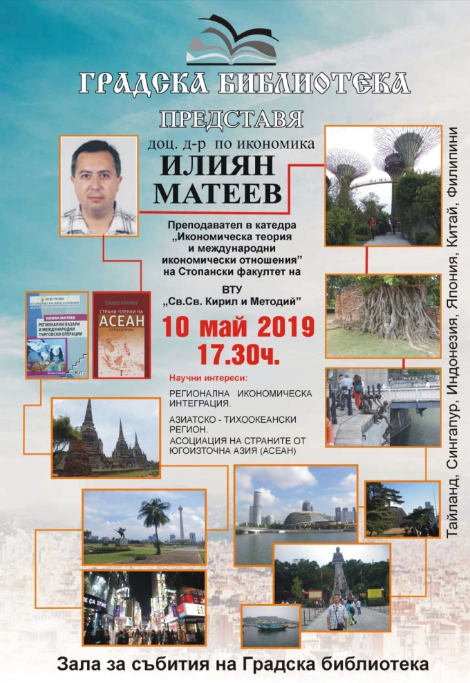 Градска библиотека Севлиево представя на 10 май т.г. от 17.30 ч. доц. д-р Илиян Матеев, преподавател в катедра "Икономическа теория и международни икономически отношения" в Стопански факултет на Великотърновския университет "С. св. Крили и Методий".