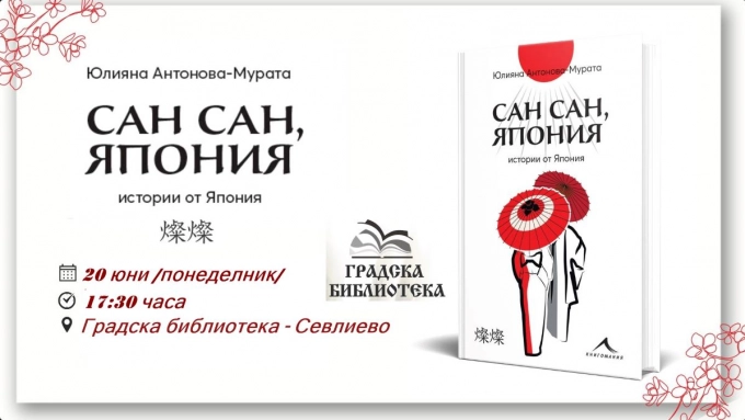 Това са думи на Магдалена Гигова, журналист и писател, за книгата на Юлияна Антонова-Мурата "Сан сан, Япония". Книгата ще бъде представена пред читатели от Севлиево на 20 юни (понеделник) 2022 г. от 17,30 ч. в Градска библиотека - Севлиево.