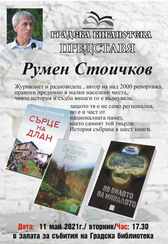 На 11 май, от 17.30 ч. Градска библиотека Севлиево ще представи Румен Стоичков - дългогодишен водещ на предаването „Нощен хоризонт“, автор на сборниците с разкази „Преди забравата“, „Из стръмнините на България“, „Някъде там“, „Сърце на длан“, „Ожадняла река“.