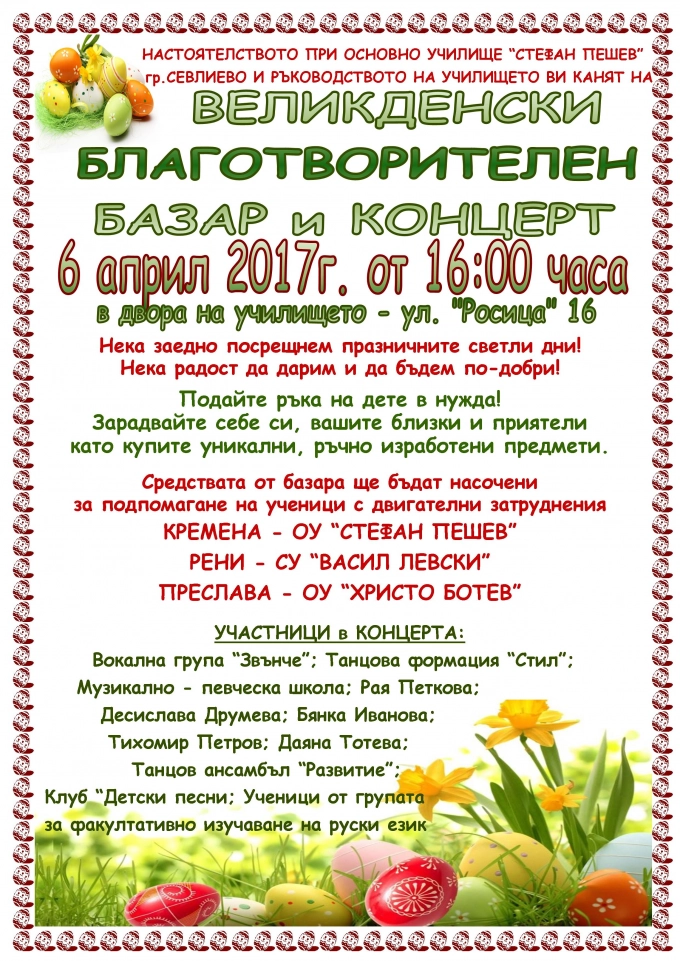 Благотворителен базар в подкрепа лечението на три севлиевски деца организират на шести април в ОУ "Стефан Пешев". Със събраните средства от продажбата на великденски сувенири, картички и предмети, ще бъдат подпомогнати семействата на Кремена от ОУ "Ст. Пешев", Рени от СУ "Васил Левски" и Преслава от ОУ "Хр. Ботев".