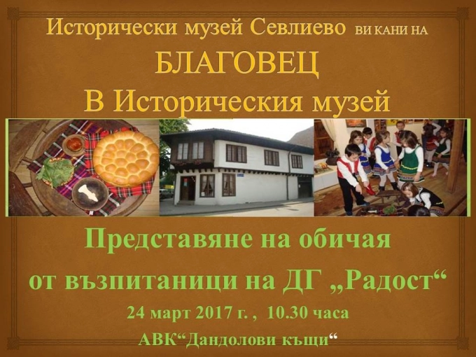 За поредна година обичаят Благовец ще бъде пресъздаден от деца от детска градина "Радост". С традиционните за празника обичаи и ритуали, децата ще покажат на своите родители и гости как българите са празнували Благовещение - първият пролетен празник, който всяка година празнуваме на 25 март за прослава на майчинството и семейството.