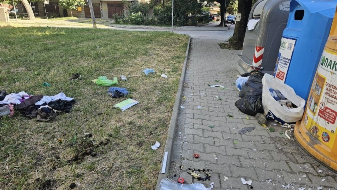 С потресаваща гледка на пръснати боклуци - текстилни и хранителни, осъмна участък от улица "Марин Попов" тази сутрин. Част от боклука е оставен до контейнера, а не изхвърлен в него, а през нощта е разпилян по близката полянка. Гледката е изключително грозна.