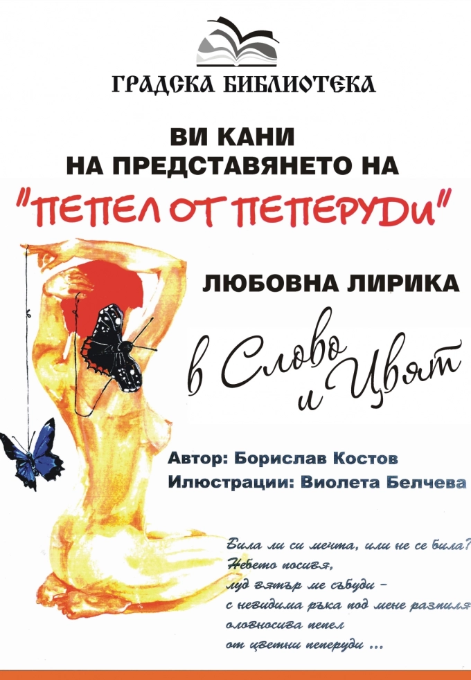На 26 юни(вторник) от 17,30 часа в читалнята на Градска библиотека писателят, журналист и театрал Борислав Костов ще представи своята нова поетична книга „Пепел от пеперуди“, илюстрирана от Виолета Белчева.