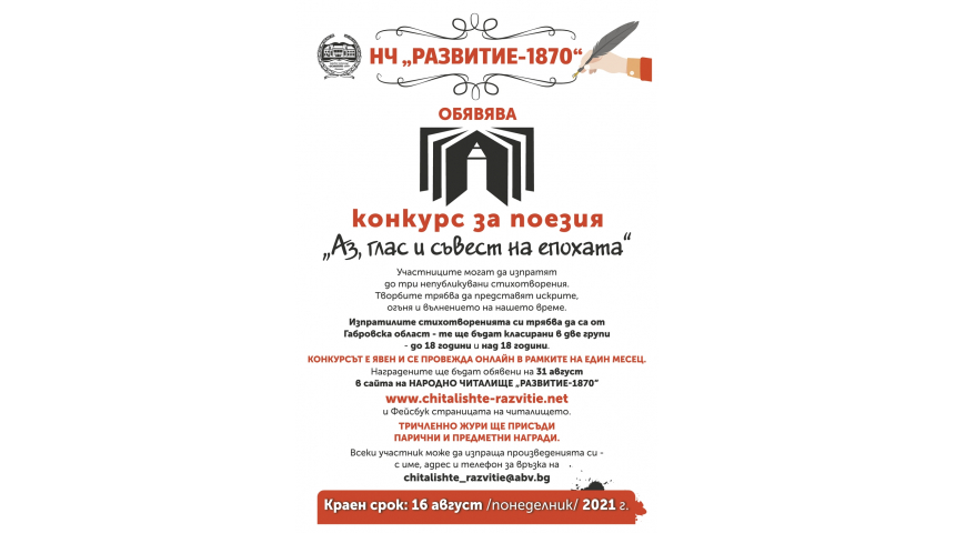 Народно читалище "Развитие-1870" в Севлиево обявява поетичен конкурс под наслов "Аз, глас и съвест на епохата".