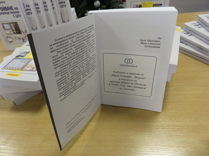 Шейсет комплекта специализирани учебници по „Програмиране на металорежещи машини с ЦПУ“ и „Настройване на металорежещи машини с ЦПУ“ бяха дарени от „Идеал Стандарт – Видима“ на учениците от специалност „Машини и системи с ЦПУ“, дуална форма, в Професионалната гимназия по механоелектротехника ПГМЕТ „Ген. Иван Бъчваров“ в Севлиево. Дарението в учебници е на стойност 3300 лв.