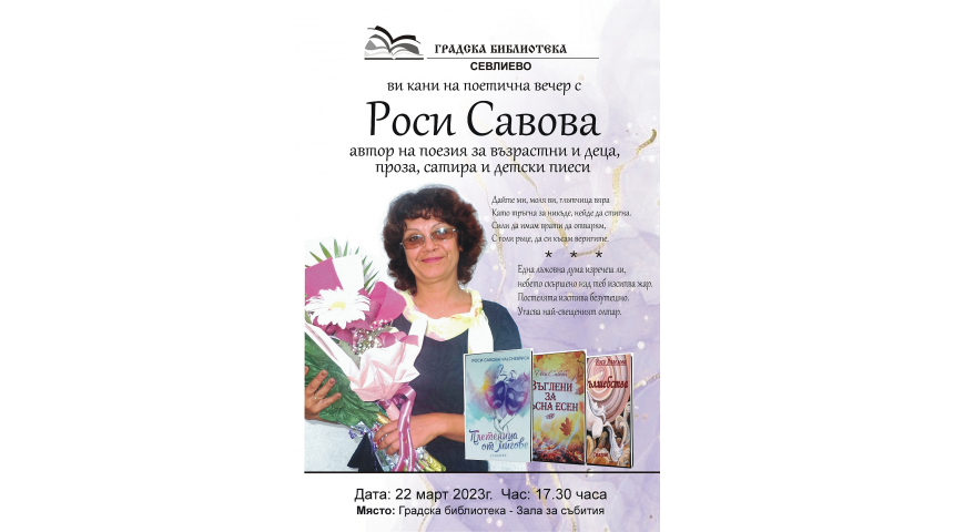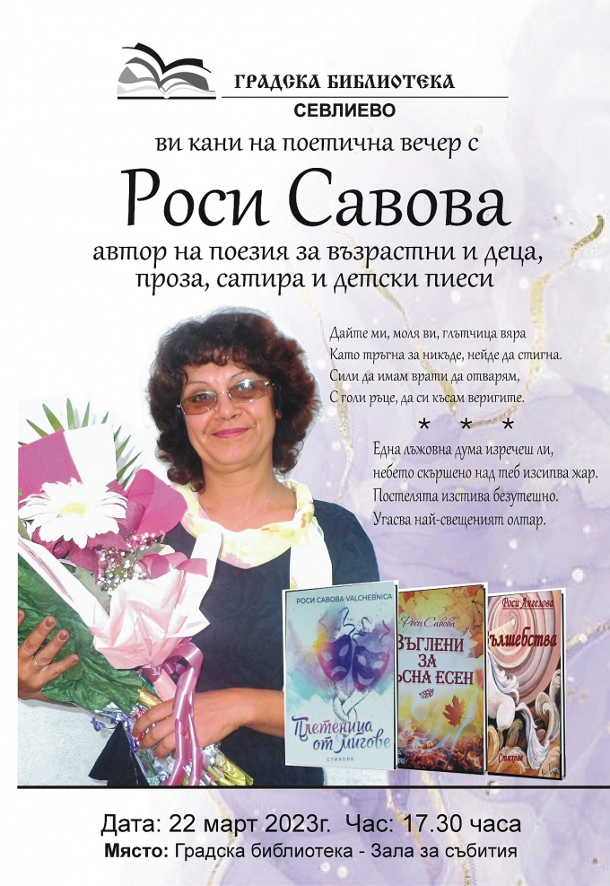 на 22 март от 17.30 ч. Градска библиотека Севлиево представя Роси Савова и нейните стихове. Поканени са всички, които имат душа за словото, но и онези, които още не са открили вълнението от поезията.