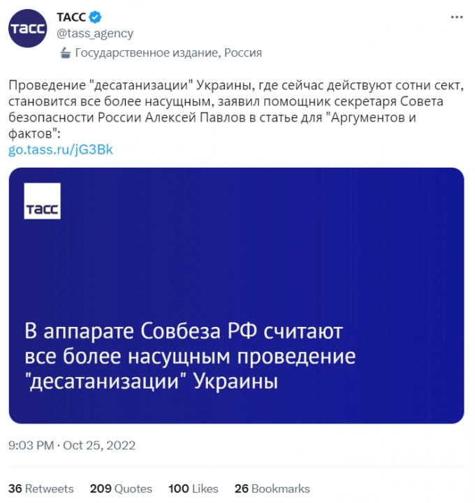 През октомври 2022 г. към първоначално заявените цели от Русия във връзка с инвазията ѝ в Украйна – „денацификация“ и „демилитаризация“, беше прибавена и нова цел. В руските медии тя беше формулирана като спешна необходимост от „десатанизация“ на Украйна.