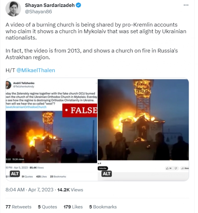 Един от най-скорошните случаи с разпространяването на „доказателства“ за враждебността срещу православието в Украйна е видео на горяща православна църква. То се споделя активно от проруски профили в социалните мрежи и се твърди, че става въпрос за църква в Миколаив, запалена от украинските националисти. Всъщност видеото е от 2013 г. и е от горяща църква в района руския град Астрахан.
