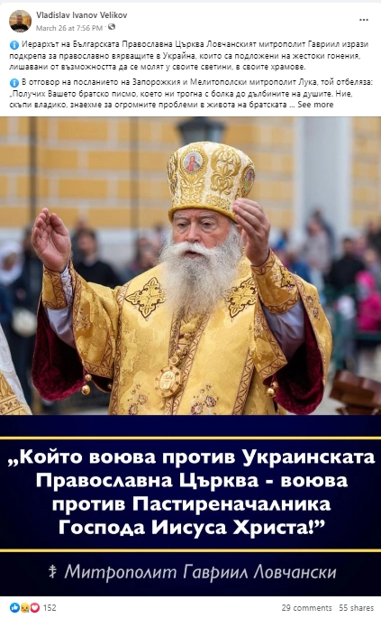 Български духовни лица също участват в разпространяването на руската пропаганда за това, че Украйна подлага на гонения православни християни. Популярност в социалните мрежи добива официално разпространено писмо на Ловчанския митрополит Гавриил, като най-често споделяният цитат от него е: „Който воюва против Украинската Православна Църква – воюва против Пастиреначалника Господа Иисуса Христа!“.
