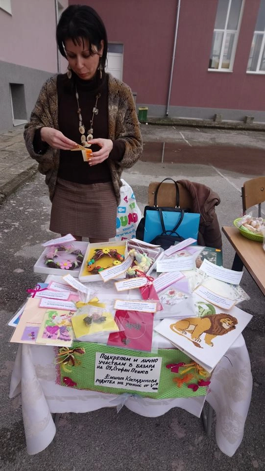 "Подкрепям и лично участвам в базара на ОУ "Стефан Пешев" написа пред собствен щанд майката на петокласник Емилия Костадинова.