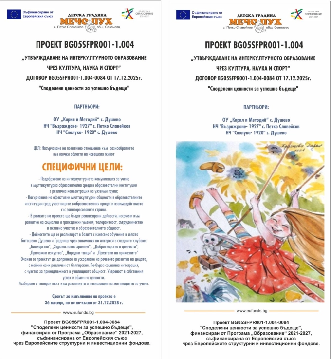Проект BG05SFPR001-1.004-0084 "Споделени ценности за успешно бъдеще", финансиран по програма „Образование 2021 – 2027", съфинансирана от Европейския съюз чрез Европейските структурни и инвестиционни фондове