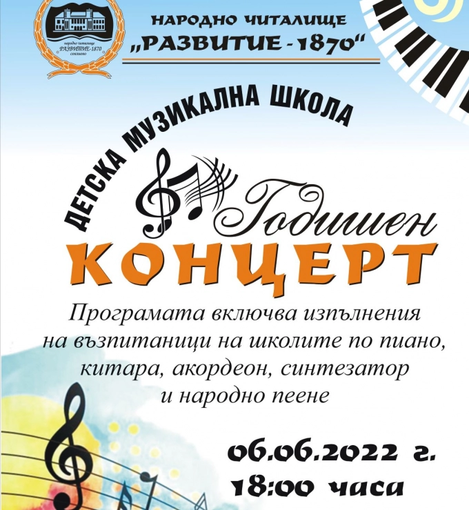 Детската музикална школа при Народно читалище „Развитие-1870” кани на годишен концерт. На 6 юни, от 18:00 ч., в обновения читалищен салон севлиевци ще могат да се насладят на изпълнения на пиано, китара, акордеон, синтезатор и народно пеене. В програмата на концерта ще се включат възпитаници на преподавателите Иглика Грънчарова-Станчева, Светла Щерева, Цветина Маринова, Ценка Ганчева и Цветан Радков.