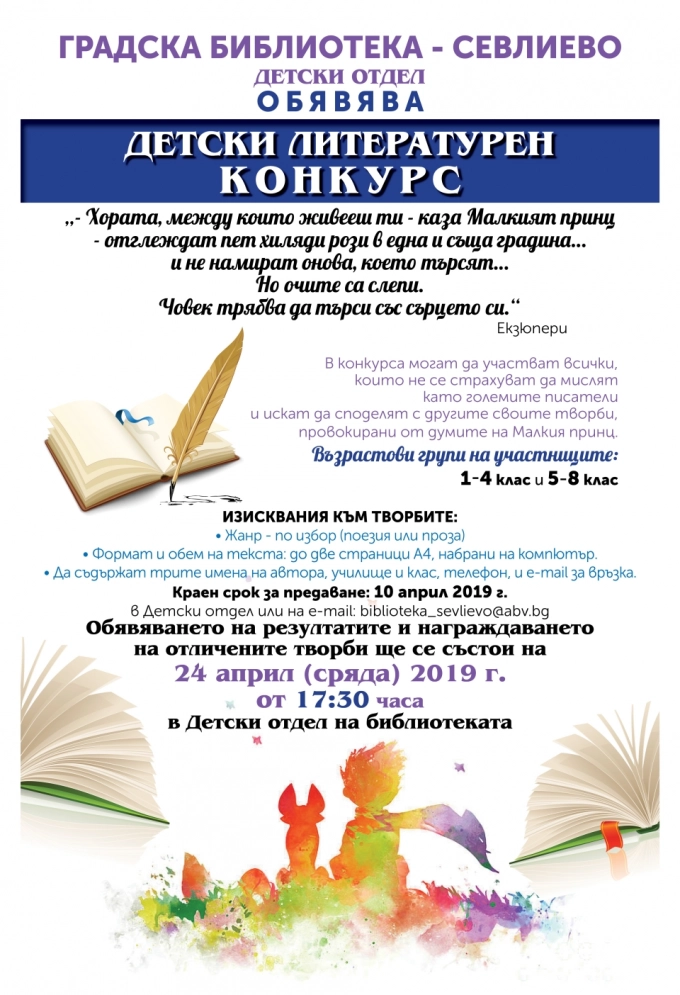 Градската библиотека в Севлиево обяви литературен конкурс за деца. В него могат да участват всички, които не се страхуват да мислят като големите писатели и искат да споделят с другите своите творби, провокирани от думите на Малкия принц: