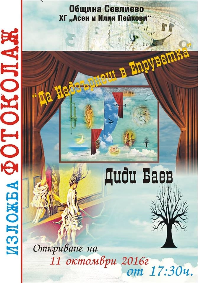 Утре, 11 октомври, от 17.30 часа, Градската галерия "Асен и Илия Пейкови" ще представи самостоятелна изложба с фотоколажи на севлиевеца Диди Баев. Изложбата е наречена "Да надзърнеш в епруветка", едно заглавие, което провокира интерес, но и очаквания у зрителя.