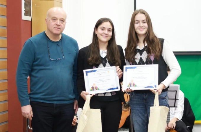 Александра Сашева и Калина Игнатова, снимка: Община Севлиево от Средно училище "Васил Левски". У „Васил Левски“. Това са момичетата, чиито гласове се чуват от училищното радио. От него може да се научи много празници, инициативи, училищните новини. Александра и Калина са доказал се екип, едни от най-дейните доброволци в училище. Няма инициатива на Ученическия съвет, която да пренебрегнат и се хвърлят с ентусиазъм във всяка. Енергията им е заразна и нея успяват да увлекат и съучениците си.В категория “Младежки дейности и инициативи за свободното време” отличен е Мирослав Йорданов.