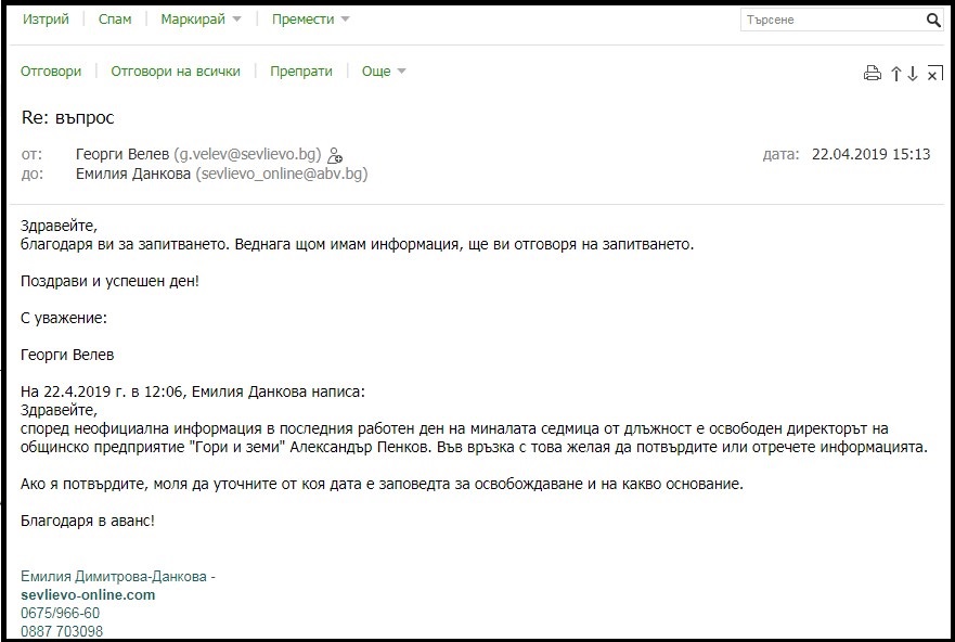 Кореспонденцията между "Севлиево онлайн" и Георги Велев от късния следобед