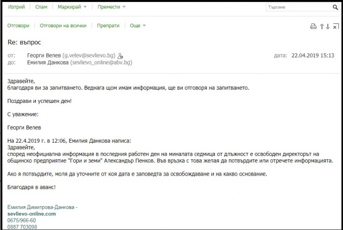По обяд въпросът бе изпратен на електронен адрес, в 15.13 ч. Георги Велев написа "Благодаря ви за запитването. Веднага щом имам информация, ще ви отговоря". В края на работния ден "Севлиево онлайн" отново се свърза с него, за да разберем дали ще получим в рамките на един ден отговор на елементарния въпрос освободен ли е или не ръководителят на една общинска структура. Последва същия отговор: "Когато имам информацията, ще ви я предоставя".
