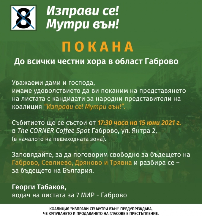 До всички честни хора в област Габрово - това е отправката на поканата, разпространена чрез медиите от Георги Табаков - водач на листата на коалиция "Изправи се! Мутри вън" за седми Габровски избирателен район.