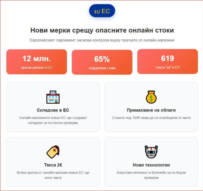 Идва ли краят на евтината онлайн търговия от китайски и други сайтове? Европейският парламент прие важни промени за контрол на евтините стоки от онлайн магазини извън ЕС. Решението получи широка подкрепа - 619 гласа „за", 26 „против" и 46 „въздържал се".
