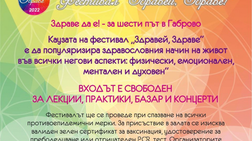 И тази година ще се проведе фестивалът "Здравей, здраве", който има за цел да популяризира здравословния начин на живот във всички негови аспекти. Лекциите, практиките и демонстрациите ще се проведат на 5 и 6 февруари в зала "Възраждане", Габрово и ще дадат трибуна на лектори и специалисти, споделящи практики, свързани с физическото, менталното и емоционалното здраве на човека. Във фоайето на зала "Възраждане" ще се намира и техника за здравна диагностика.