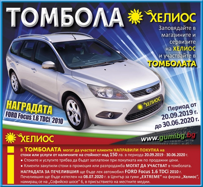"Хелиос" АД - доставчик на автомобилни гуми с два автосервиза в Севлиево, обявява томбола за своите клиенти с голяма награда лек автомобил Ford Focus 1.6 TDCi 2010.