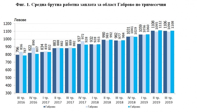 Област Габрово се нарежа на седмо място в страната по средна брутна месечна работна заплата след София (столица), Стара Загора, Варна, София (област), Враца и Разград, сочат данни на отдела "Статистически изследвания" към Териториалното статистическо бюро.