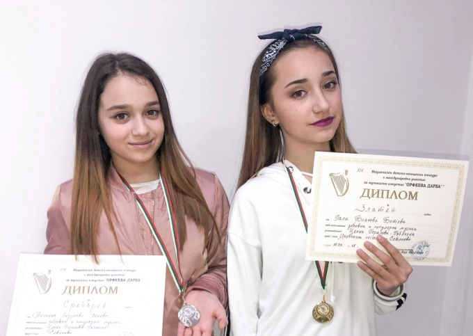 Гала Ботева, солистка на вокална формация "Upstream Voices”, с вокален педагог Ценка Горалова, спечели златен медал, а Антония Пенева - сребърен медал от 14-ия национален детско-юношески конкурс за музикално изкуство „Орфеева дарба- 2018”, който се провежда под патронажа на Столична Община.