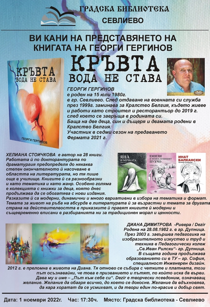 Георги Гергинов, когото повече севлиевци свързват с участието му в реалити формата "Фермата", ще представи своята първа стихосбирка, озаглавена "Кръвта вода не става". Представянето е насрочено за 1 ноември, от 17.30 ч. Домакин е Градската библиотека.