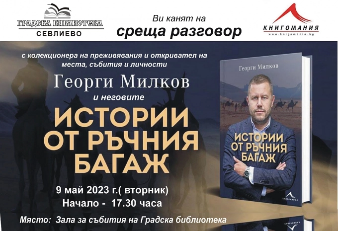 Георги Милков ще гостува в Севлиево за представянето на "Истории от ръчния багаж" пред местната публика. Събитието е част от програмата на Градската библиотека - на 9 май 2023 г., от 17.30 ч.