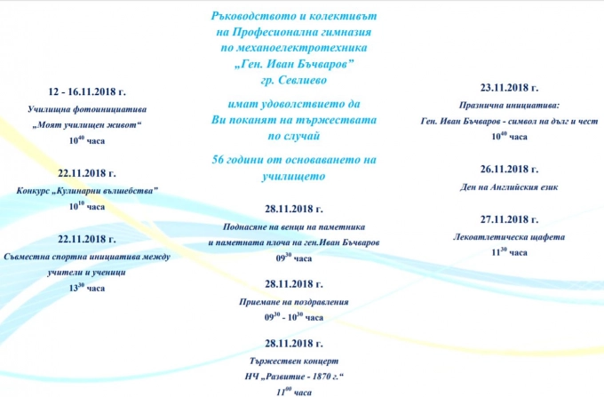До края на ноември професионална гимназия по механоелектротехника "Ген. Иван Бъчваров" отбелязва своя патронен празник с редица инициативи. В някои се включват основно ученици, в други учители и ученици ще влязат в спортна битка, а в традиционната вече кулинарна изложба участие вземат и родители. Един общ празник, какъвто може да бъде само празникът на училище.