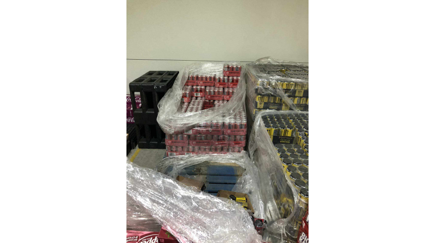 При проверката са установени складирани и подготвени за последваща експедиция пакетирани хранителни стоки и напитки от различни марки, всичките в големи количества.