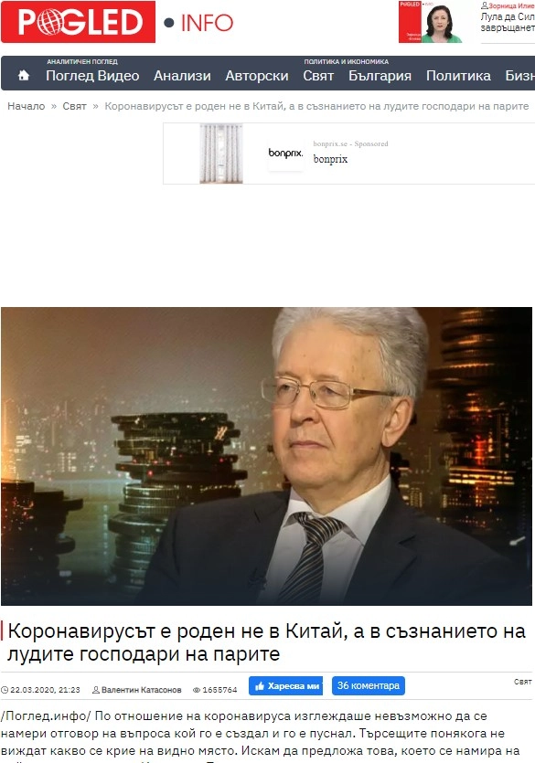 Публикация от 20 март 2020 г. със заглавие „Коронавирусът е роден не в Китай, а в съзнанието на лудите господари на парите” бележи рекорд от над 1.65 милиона прочитания според брояча на сайта „Поглед.инфо”. Текстът развива конспиративната теория, че пандемията се случва по план, подготвен от световния икономически елит години преди самите събития. Автор на материала е Валентин Катасонов, бивш преподавател по международни финанси в Московския държавен институт за международни отношения. Българският превод на текста в „Поглед.инфо” e споделен в 164 различни групи и страници във Фейсбук с обща аудитория от над милион и половина потребители.