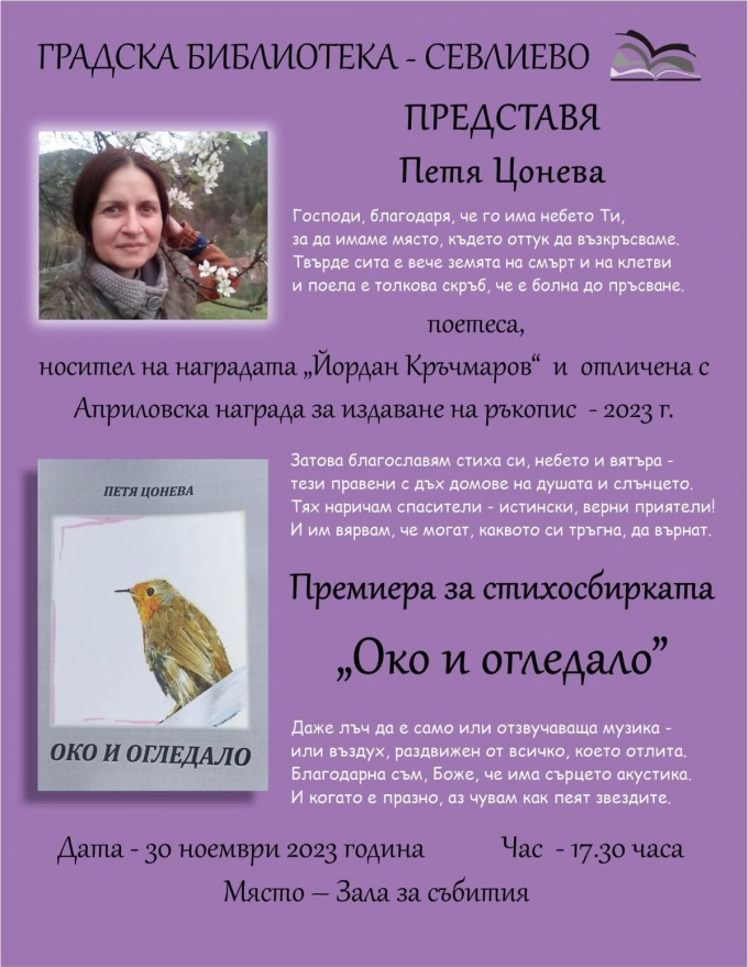 На 30 ноември от 17.30 часа Градската библиотека в Севлиево кани на поетичната вечер на Петя Цонева.