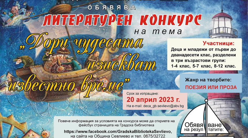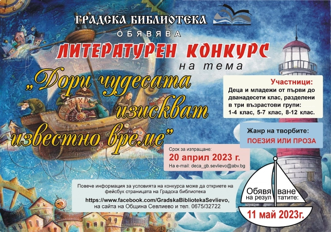 Градска библиотека Севлиево обявява литературен конкурс за деца и младежи от първи до дванадесети клас. Тъй като през 2023 г. се навършват годишнини на бележити и любими автори, темата на тазгодишния конкурс произтича от тяхното творчество.