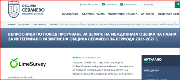 По повод извършването на междинна оценка на изпълнението на Плана за интегрирано развитие (ПИРО) на община Севлиево за периода 2021-2027 г. Агенция СТРАТЕГМА, която извършва оценката, публикува на сайта на Община Севлиево три въпросника.