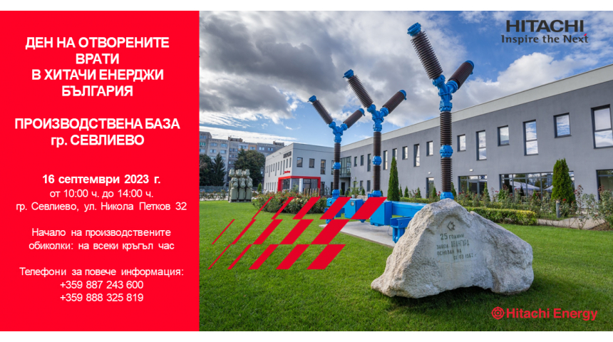 Заповядайте на 16 септември, събота, от 10 ч. до 14 ч. в Завода за производство на оборудване за високо напрежение на Хитачи Енерджи в гр. Севлиево, ул. „Никола Петков“ 32. Обиколките ще стартират на всеки кръгъл час, като всички посетители ще трябва да преминат кратък инструктaж за безопасност.