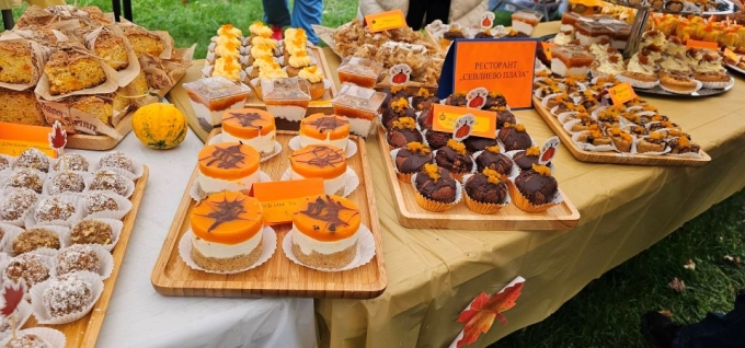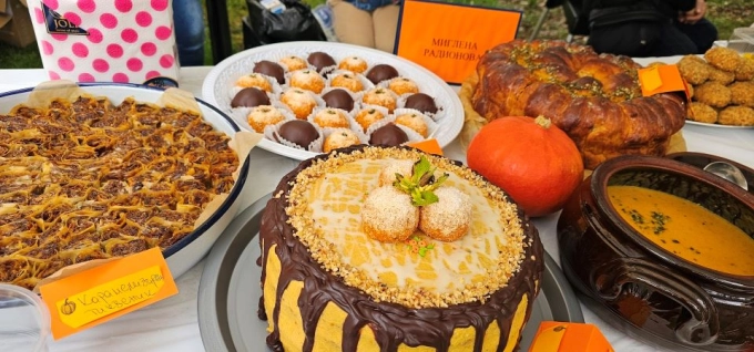 В изложбата имаше всичко, или поне така изглежда за минаващия покрай щандовете, богато отрупани с храна, в която основната съставка е тиква. Имаше еклери с тиква, баници с тиква, печена тиква, мъфини с тиква, пастички с тиква, триеница с тиква, сладко от тиква, популярно като рачел и разбира се торти с тиква, които съперничеха на сътвореното от най-големите майстори сладкари.