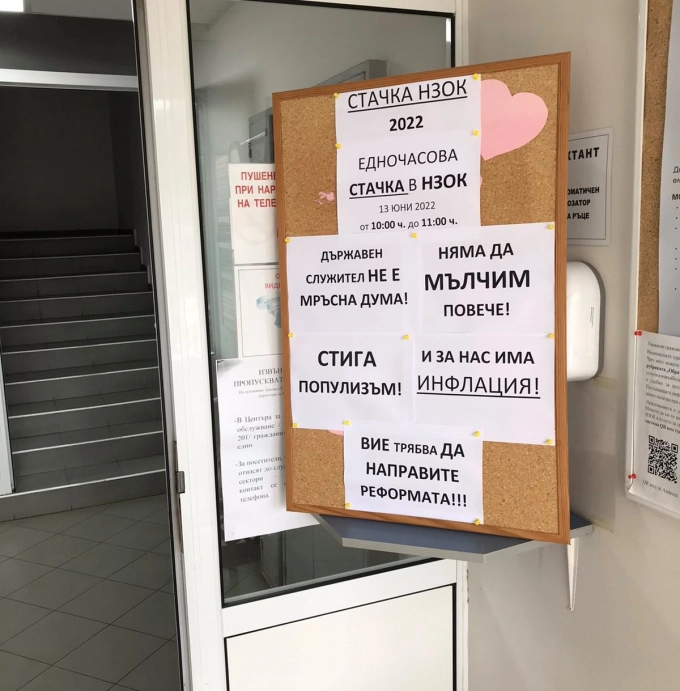 Офисът на РЗОК днес посрещаше посетители с надписи "държавен служител не е мръсна дума", "няма да мълчим повече", "стига популизъм" и "вие трябва да направите реформата". Ако исканията на протестиращите не бъдат чути, те заплашват, че ще спрат плащанията към болници, аптеки и медицински заведения.