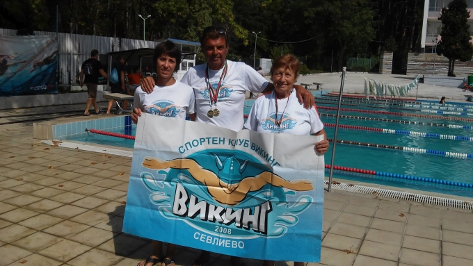 Със злато се окичиха Боян Ботев и Стефанка Стефанова на провелото се на 10 и 11 септември в Сандански Държавно лично отборно първенство по плуване. Едно състезание, изпълнено с емоции и интересни преживявания, където участниците бяха на възраст от 25 г. до 84 г., но истината е, че възрастта нямаше никакво значение за никой от тях. Всички плуваха според възможностите си и бяха щастливи, че са на това събитие. В надпреварата се включиха 281 състезатели от 19 клуба в цялата страна. СК” Викинг 2008 – Севлиево” беше представен от Стефанка Стефанова, родена през 1941 г., Боян Ботев, роден през 1961 г. и Павлина Станчева, родена през 1974 г.