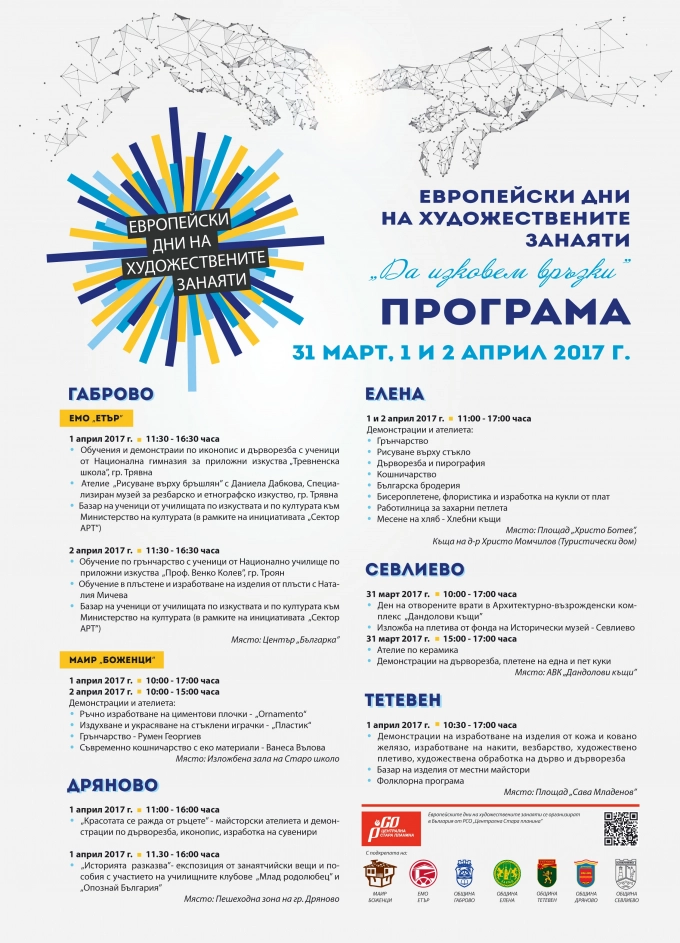 За трета поредна година България става част от Европейските дни на художествените занаяти, като през 2017 г. местни власти, музеи, училища за приложни изкуства и занаятчии са обединени от темата „Да изковем връзки”. Дните 31 март, 1 и 2 април са избрани за популяризиране на разнообразието от занаяти и насърчаване на контактите на майсторите с партньори от различни сфери (културна, социална, икономическа), различни поколения, различни сектори и различни територии. В нашата страна инициативата се координира от РСО „Централна Стара планина”.