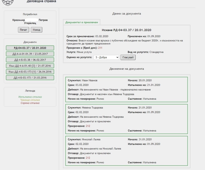 На 20 януари т.г. искането е внесено в Общината и отнесено на вниманието на кмета Иван Иванов. Това е отразено като "първоначално насочване", след което пише, че "документът е насочен към Невена Тодорова" (зам.-кмет с ресор "Териториално и селищно устрйство, б.ред.). Срокът, който Невена Тодорова има за отговор е 2 февруари 2020 г. В справката пише, че документът е приключен на 1 септември т.г. и се уточнява, че има просрочие от 212 дни. По отношение на преписката пише "изпълнена".
