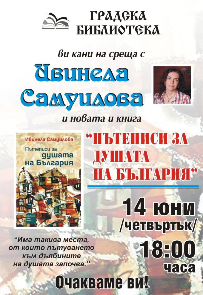 Последната си книга - "Пътеписи за душата", ще представи в родното Севлиево Ивинела Самуилова. Тя ще се срещне със севлиевци на 14 юни т.г. от 18 часа в Градската библиотека.