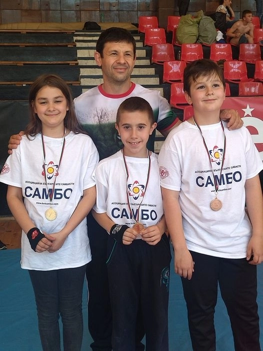 Треньорът Евгени Генов с Мелиса Халил, Иво Тодоров (в средата) и Владимир Фукаров, снимка: СК "Раковски" От ръководството на клуба изказват благодарност на Асоциацията на българските самбисти, в лицето на нейния председател Димитър Димитров, за осигурените нощувка и храна по време на шампионата, както на Момчил Кънев - управител на "Никипласт-М", на завода за санитарна керамика на "Идеал Стандарт-Видима" и на всички, съпричастни с дейностите в клуба и подкрепящи състезателите.