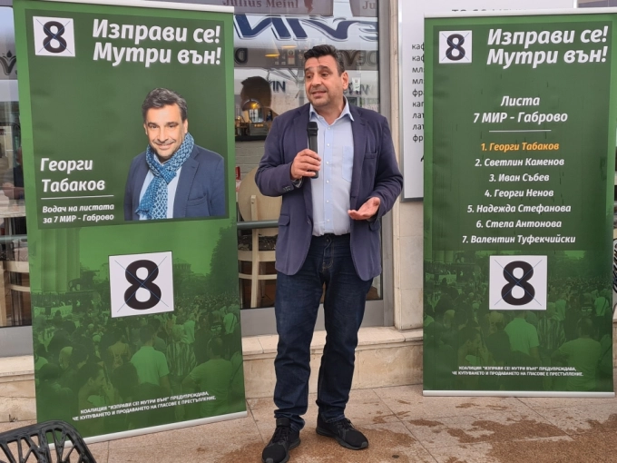 „Изправи се! Мутри вън!” има огромен потенциал да спечели доверието за мандат от Габрово. Коалицията е с номер 8 в бюлетината. Тя тръгва в изборите с много амбициозна листа за 7-ми МИР-Габрово. За да спечели мандат в област Габрово, коалицията издига за водач национално доказания икономист Георги Табаков.
