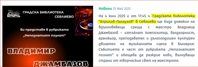 Градската библиотека на Севлиево се оказа, че се казва "Априлов-Палаузов". Така е наречена в публикация на официалния сайт на Община Севлиево, който съобщава за предстоящо събитие в културната институция.