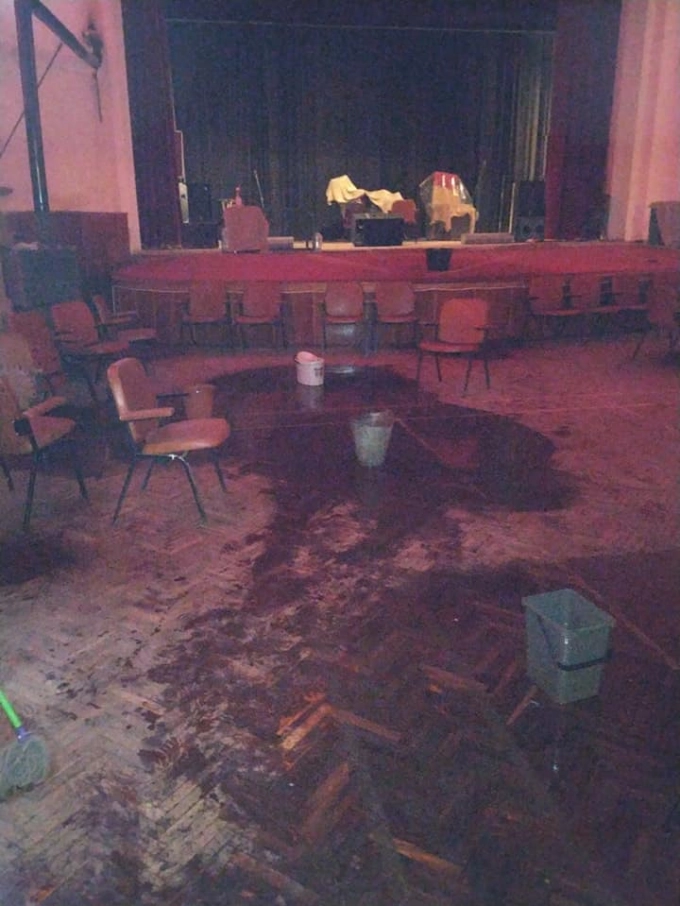 "Водата тече в салона на Читалището. Стича се по стените, където са лампите. Лампите до една изгоряха. Петнайсетлитрови кофи подлагаме, пълнят се за минути. Вече не ни стигат кофите. Не можем да спасим паркета, няма начин да не се надигне, всичко плува във вода."